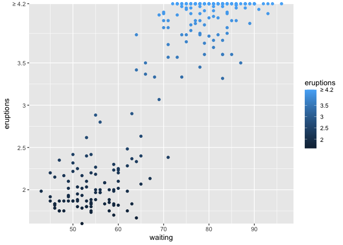 | ggplot(faithful, aes(waiting, eruptions, color = eruptions)) + | |