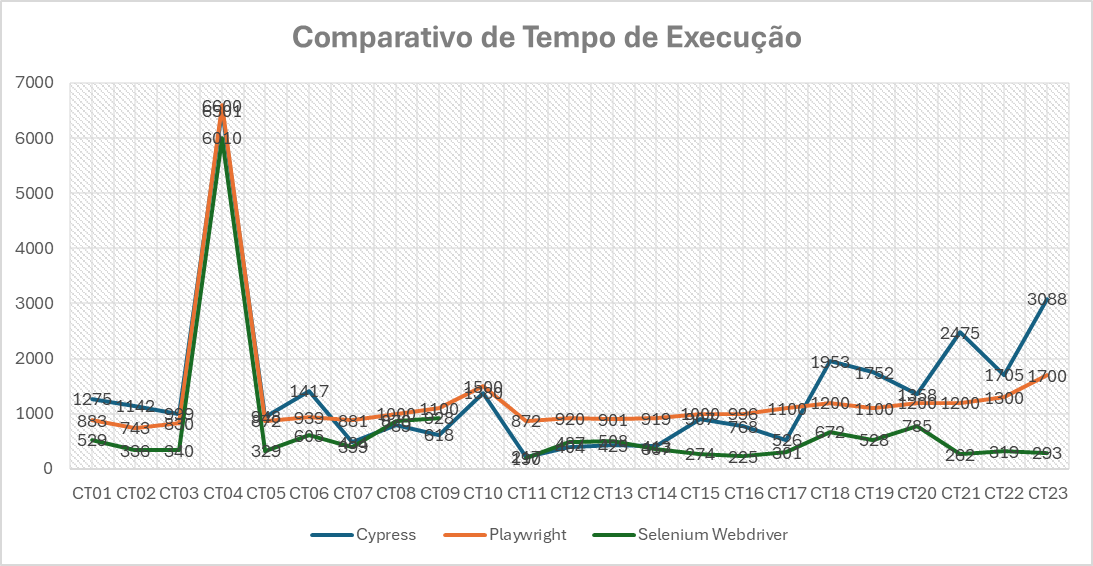 Fazendo a conversão do tempo de execução de todos os testes para milissegundos, para uma avaliação mais adequada, vemos que nos testes que passaram o Selenium teve um desempenho melhor de velocidade, porém, não é possível verificar o tempo de execução do teste que falhou. Vale notar que, nos fluxos mais curtos, as validações do Cypress foram mais rápidas que o Playwright, mas, nos mais longos, o Playwright teve um alto ganho de performance. A Figura 21 mostra o comparativo entre os tempos de execução. Os testes do Cypress e Playwright foram executados no modo headless, enquanto que o teste do Selenium precisou ser executado no modo headed, porque no modo headless vários testes que funcionam estavam retornando erro.