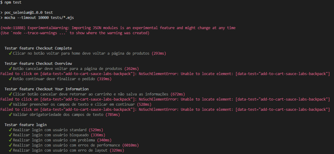 Mesmo com a instalação do Mocha, o projeto enfrentou problemas ao executar alguns testes do fluxo, gerando resultados falso-positivos, em que era informado no log que não foi possível executar uma ação mesmo quando ela havia sido realizada corretamente. O Selenium suporta os navegadores Chrome, Firefox, Edge e Safari, sendo necessário criar algumas configurações adicionais para este último. Na execução dos testes em modo padrão, o teste que verificava adicionar e remover toda a lista de produtos do carrinho de compras sempre retornava um falso-positivo porque o framework não conseguia fazer o clique no último botão para remover do carrinho. Quando executado em modo headless, esse teste passava sem erros, mas outros que funcionavam normalmente retornavam falso-positivo.