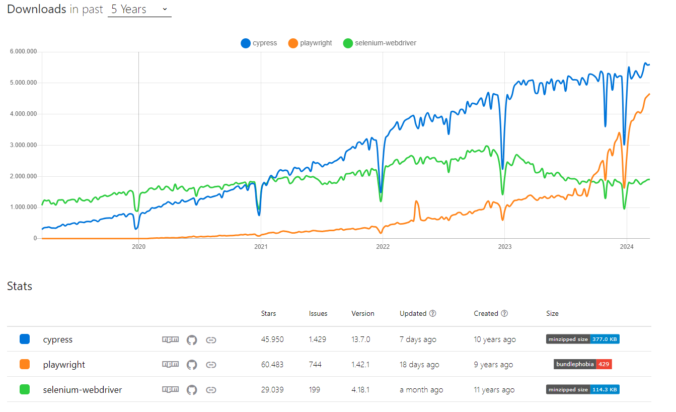 NPM Trends: Comparativo do número de downloads Cypress x Playwright x Selenium Webdriver https://npmtrends.com/cypress-vs-playwright-vs-selenium-webdriver Acessado em: 23/04/2024