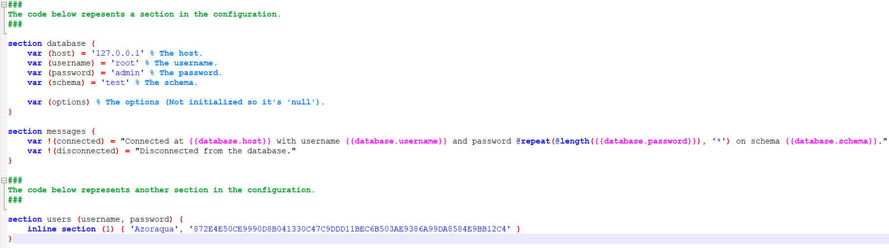 | var !(connected) = "Connected at {{database.host}} with username {{database.username}} and password @repeat(@length({{database.password}}), '*') on schema {{database.schema}}." | |