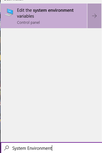 3. Open the start menu (search menu), and search for System Environment, open it.