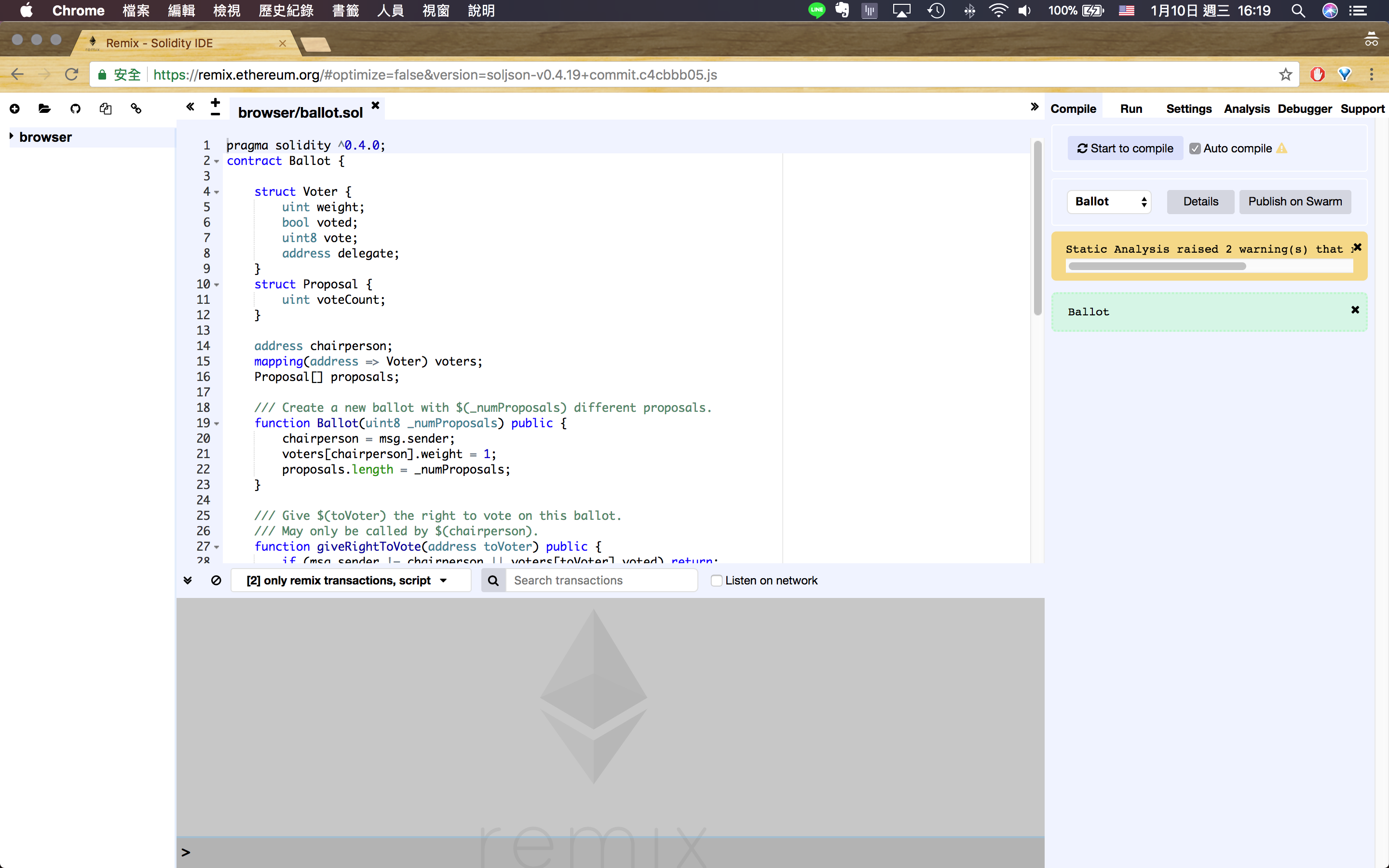 Remix 預設會自動編譯。會看到旁邊有橘橘的 warning,代表編譯完了,但 warning 可先不管,不影響合約執行。