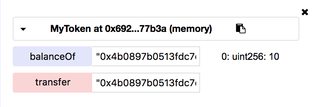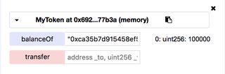 合約部署成功後,可以看到合約的使用介面。Remix 會自動根據合約的內容,產生對應的合約使用介面。可以看到合約有兩個功能:balanceOf(查詢餘額) 和 transfer(轉移代幣)。