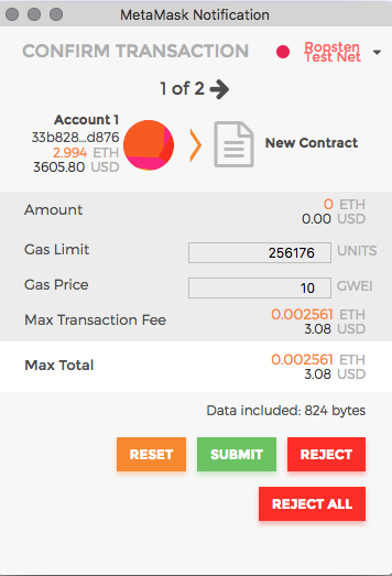 接著用剛才同樣的方式,按 create 部署合約,就會看到 MetaMask 的彈出視窗。直接按 submit 發送交易。