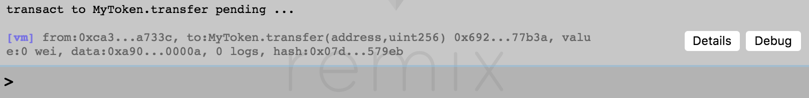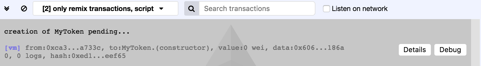 底下可以看到 log(紀錄每一次的操作)。實際上部署合約是透過一個 Ethereum 交易完成,點 Details 可以看到該筆交易詳細資料。