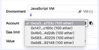 Environment 選擇 JavaScript VM 代表所有資料都是存在本地記憶體(功能類似 testrpc)。它會提供 5 個虛擬帳戶每個有 100 ETH,隨便選一個帳戶(要記住)。