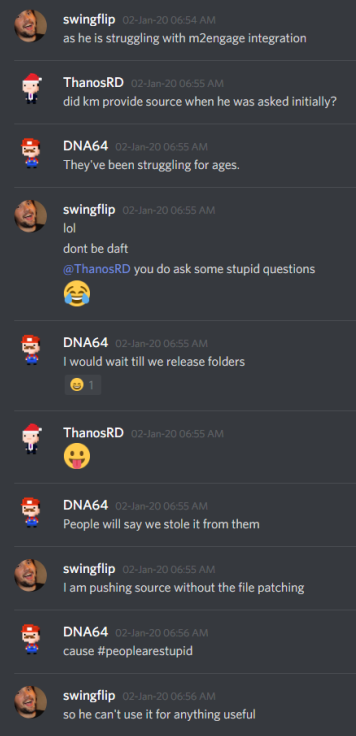 Shortly after this video was posted, swingflip deleted all of the chat history in public and developer channels under the guise of "spring cleaning", he then proceeded to say that backups were made, but when they were requested he later admitted that he lied.