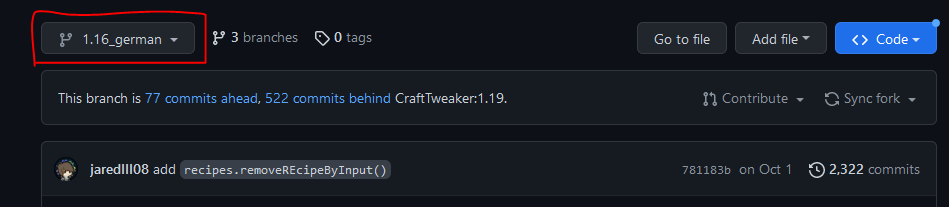 Branches are a way to separate and organize code in a project. It is important to have the right branch selected when editing files and submitting your pull request to avoid editing outdated or experimental files. This will also help avoid making invalid changes to the mod. While there are no universal standards mod developers will often use branches to seperate their code based on the Minecraft version or mod loader. For example 1.19.2 would have all the MC 1.19.2 code while 1.16.5-fabric would have all the code for the MC 1.16.5 Fabric version. The name main or master may also be used as a general catch-all for whatever the dev is actively working on. You can view the full list of branches from the main page of the repository by clicking the branches text. If the branch names are not clear you can always reach out to the author for more information.