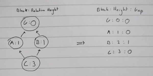 This attack can be prevented by limiting the depth of a reorganization. And we can do this by observing a block's relative height vs. its absolute height. The relative height is the height that the block would appear if it was at the tip of the longest known thread. The exact height is the height that the block appears at in the longest known thread. The block's 'gap' is the difference between the relative height and the exact height: