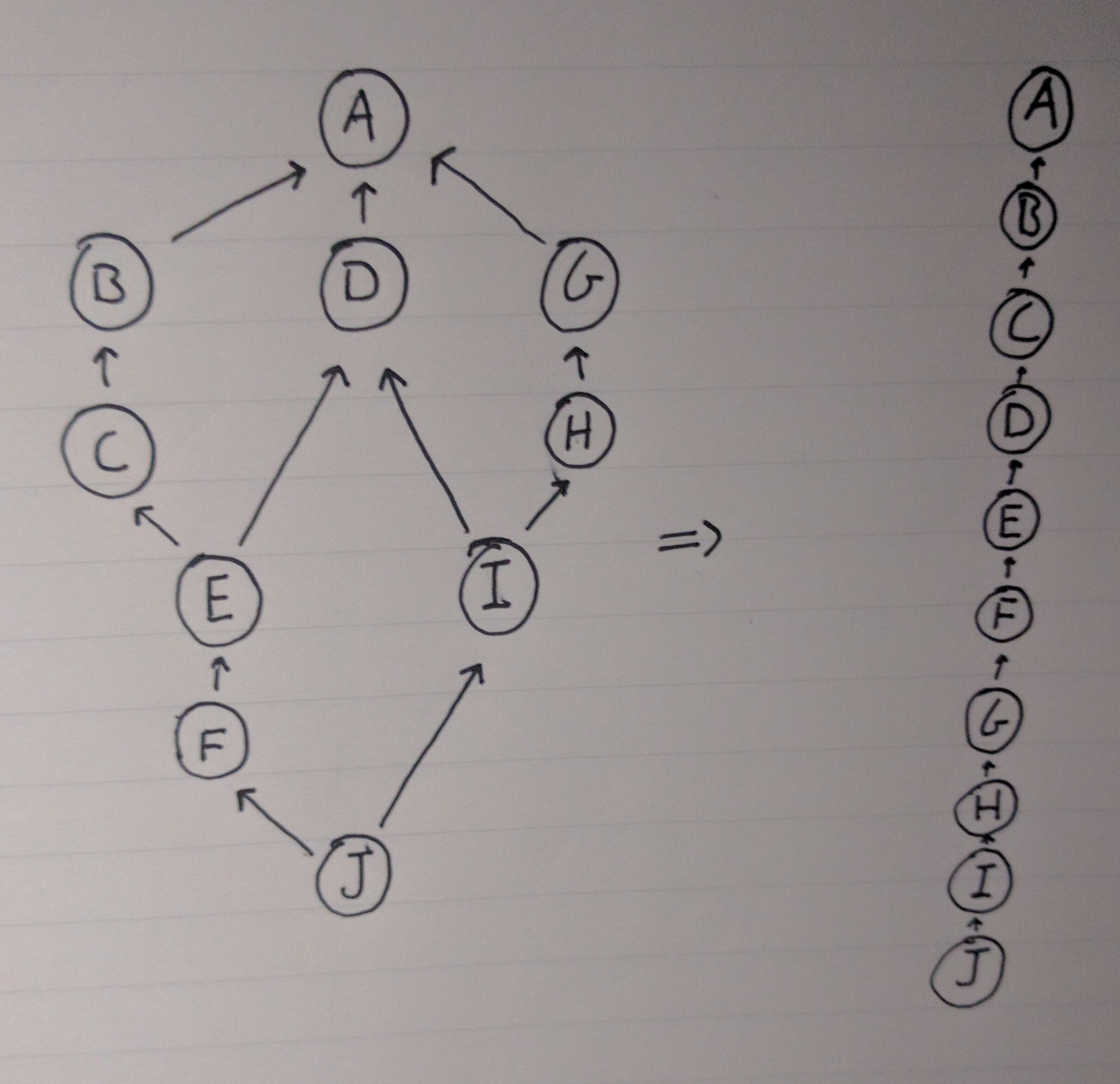 Prior to block 'J', there are two threads, 'ABCDEF' and 'AGHID'. They each have common ancestry 'AD', however they only have identical ancestry 'A', because 'D' has different strictly-ordered parents in each thread. When performing the merge with 'J', you start with the identical ancestry 'A'. Then you merge the heavier parent, which would be 'BCDEF'. Finally, you merge the lighter parent 'GHID'. An important note here is that 'D' is already in our chain, so we exclude it when merging. The result is 'ABCDEFGHIJ'.