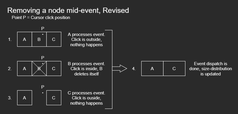 The next problem to solve was how and when the GUI should reflect a change in how size is distributed. More specifically, I need to take into account that the GUI data-structure can be modified while it's dispatching events. Let me walk you through an example of the problem.
