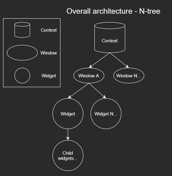 The data structure I ended up with is essentially the standard N-tree. The root is a struct I've dubbed the Context. This is essentially a container for the top-level windows, and it accepts the state that would otherwise exist as global state in other libraries. This includes current input-state such as mouse-position, and also manages things like text font-loading and the InputConnection.