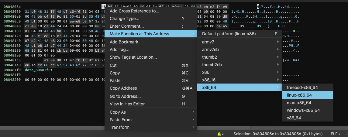 Clicking this creates a 64 bit function at the address we know we’re jumping into once flipping the processor into 64 bit mode, and voila!