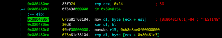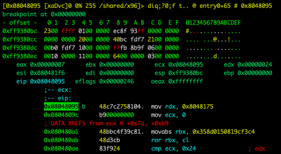 Next we come to this movabs rbx, 0x358d0150819cf3c4 instruction. That literally just writes the value 0x358d0150819cf3c4 into eax, but remember since we don’t have a 64 bit register (or rather our registers are in compatibility mode), only 0x819cf3c4. I’m not sure if this is a shortcoming of radare2 or if the registers are also operating in 32 bit mode with this cs register switch.