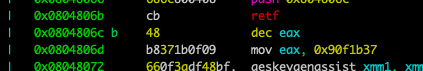 0x804806b retfThe retf in particular sticks out, since it’s a return function from our entry point? ret will usually just blindly jump to whatever address is on the stack (IIRC), so it must be being used here for that. I’ve seen a lot of ret instructions, but never seen the retf instruction before. Weird.