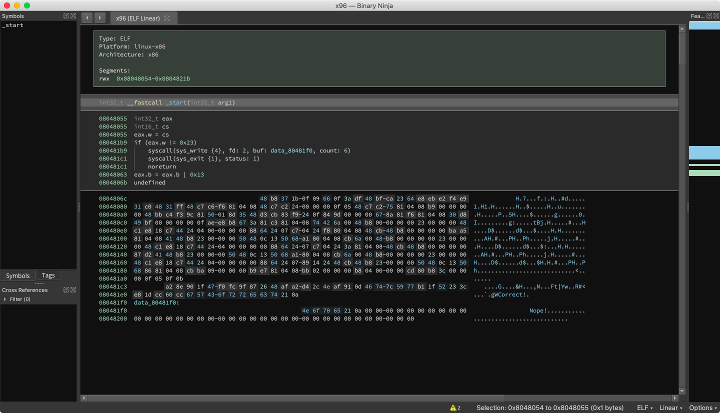 0x804805c jne 0x80481a5 <0x80481a5>So here’s our entry point. The real question we need to ask is what’s up with that cs register, and why is it examining whether it’s a 0x23? We already know if it’s not 0x23 it’ll jump to our Nope! code and fail out.