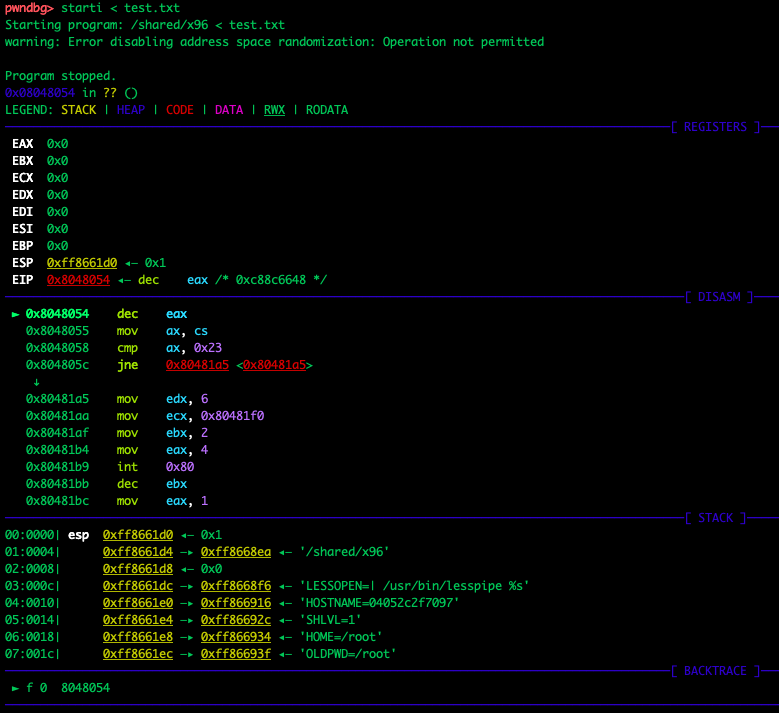 As you can see, we’re dropped into a shell that auto-breaks at our entry point (0x08048054) - great!