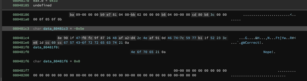 An astute observer will maybe see something I missed originally, which is that in Binary Ninja the first byte at 0x80481c3 is being coerced into a 1 byte char array. Let’s un-define that so we get our whole buffer (otherwise things will be 1 byte off, and cause you to question your reality again, and no-one wants that).