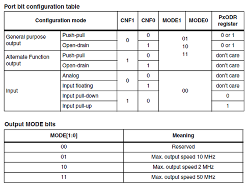CRH is used to set type/and or speed of pins 8-15 of the port CRL is used to set type/and or speed of pins 0-7 of the port Accessed as a 32 bit word, with 4 bits representing the state of each pin. Out of these 4 bits, the low 2 bits are MODE, and high 2 bits are CNF.