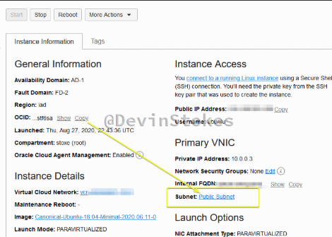 When viewing your instance in the control panel, under “Primary VNIC” click “Public Subnet”