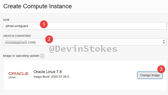 First we input a name for our instance and second select the compartment (the default is fine). Then we need to click “Change Image”. We need to select “ Canonical Ubuntu 18.04 “.