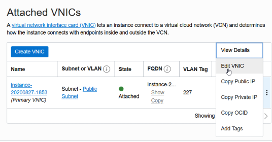 After creating the virtual machine scroll down and click “VNIC” on the left in the side bar under Resources and edit your VNIC.