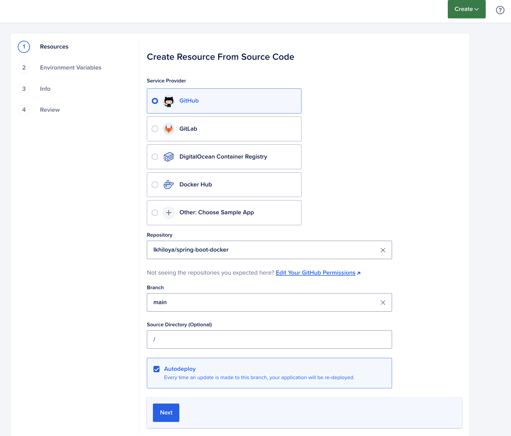 You'll be prompted to link your preferred GitHub repository which will require you to authorize DigitalOcean to be able to access your repositories. Choose the spring-boot-docker repository you created earlier and click on next as shown below: