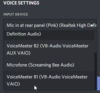 I have renamed my devices, so yours will probably show up as "Voicemeeter Virtual Output" (there'll be two of them, usually B1 is the one that says "Voicemeeter VAIO" on the desc, and B2 says "Voicemeeter AUX VAIO")