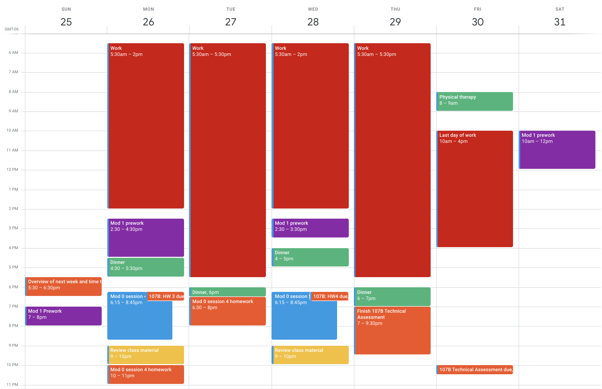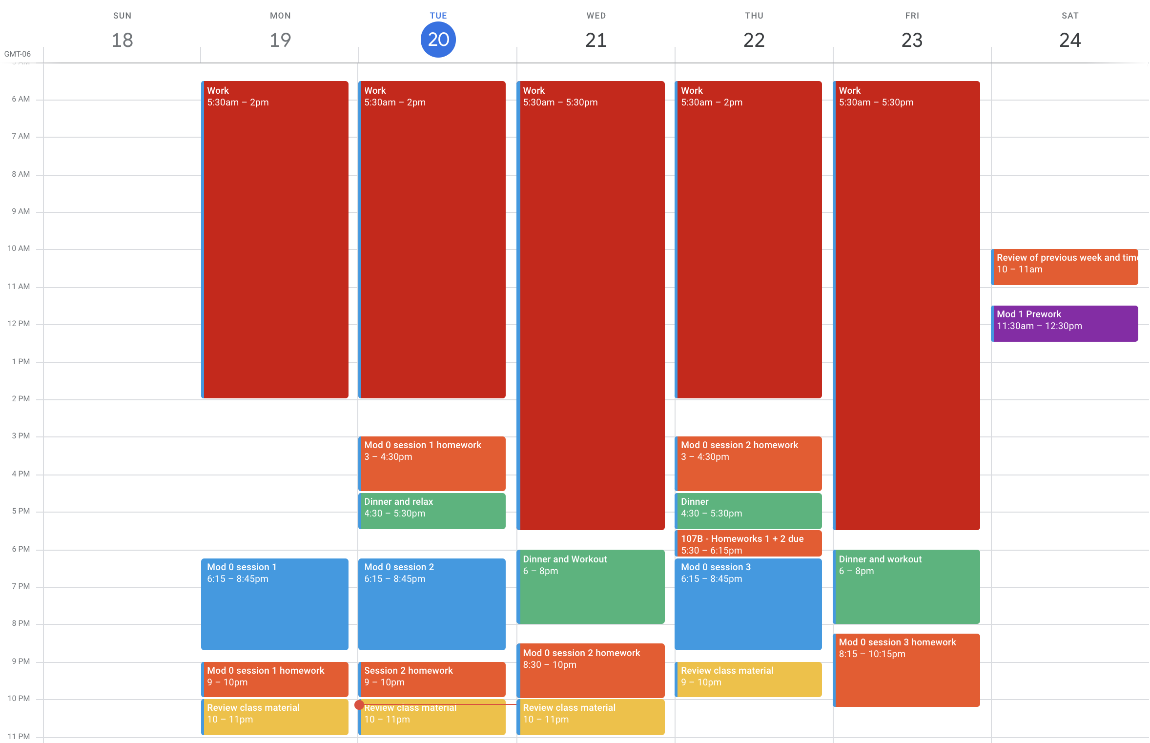 As outlined in class, using different colors in your calendar for parts of your life (Turing, wellness, commitments, etc.) can make it easier to parse through your competing priorities. Here is a suggestion you could use for your Mod 0 Calendar...