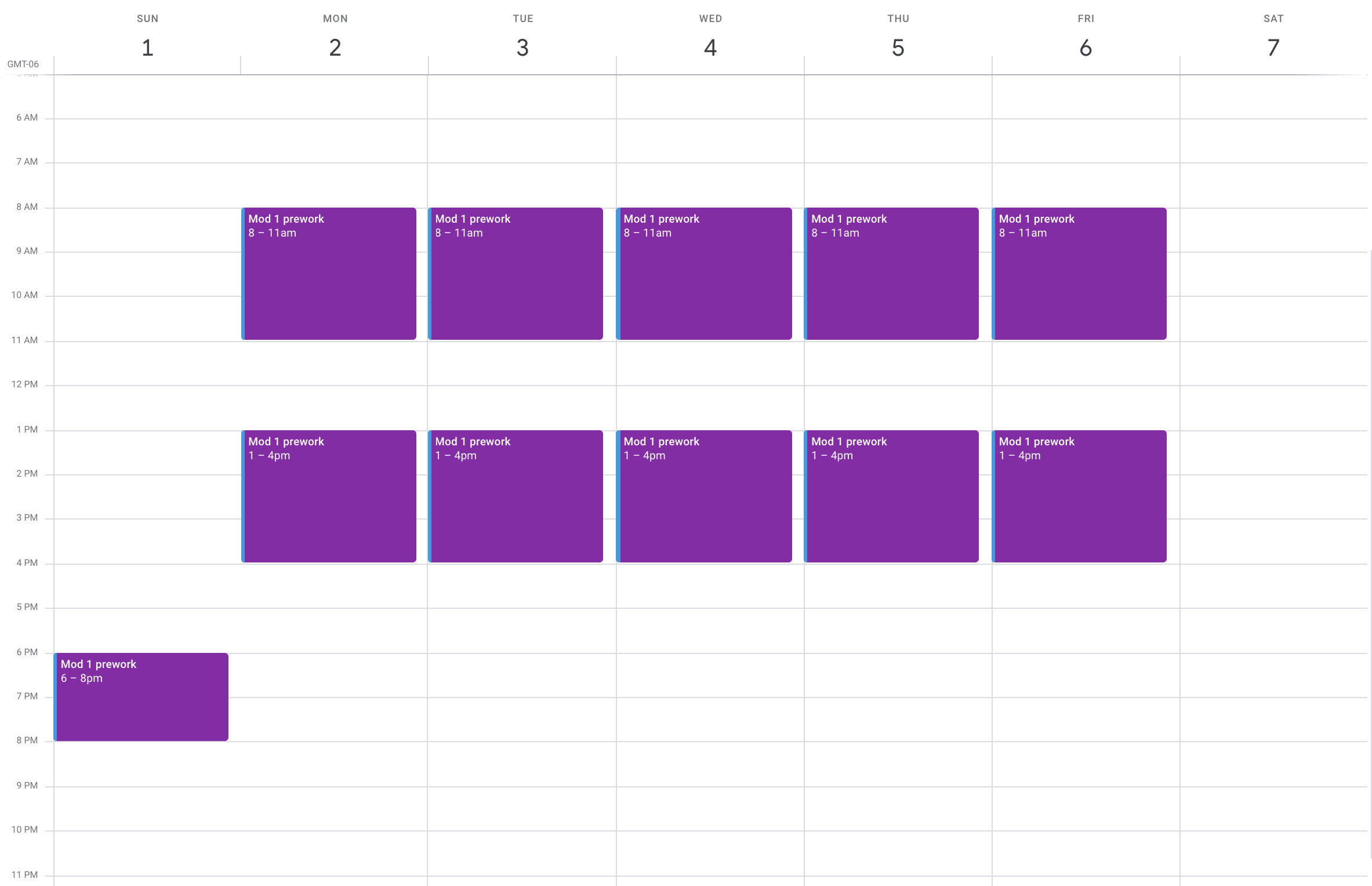 Create a calendar using a tool of your choice (Google Calendar, iCal, etc.) for the remainder of Mod 0 until your due date for the Mod 1 Prework. Your calendar should include the following: