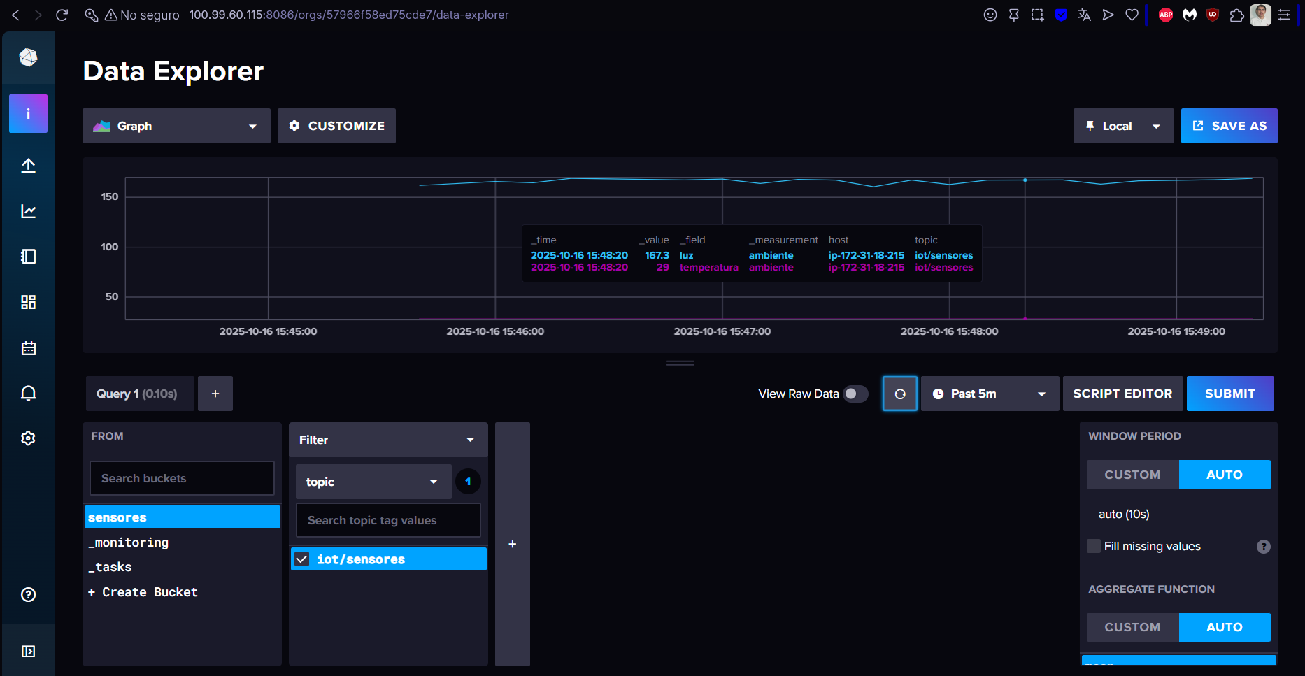 Se utilizó Telegraf para consumir los datos publicados en el broker MQTT (iot/sensores) y almacenarlos directamente en InfluxDB dentro del bucket sensores.