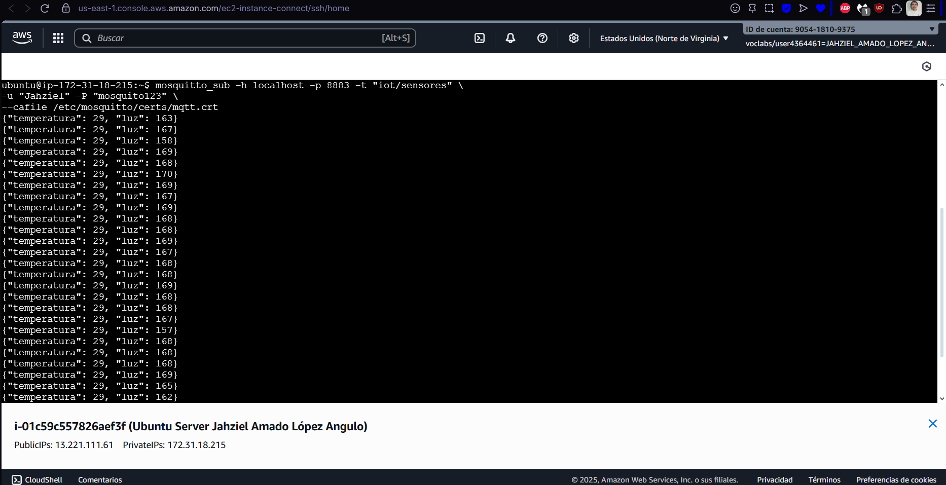 En el servidor EC2, un servicio Flask recibe la información y la reenvía de manera segura hacia el broker MQTT (Mosquitto) con autenticación y cifrado TLS.