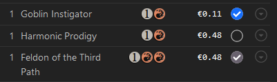 You will then see checkmarks next to the cards. They indicate if you have a full match (blue checkmark), partial match (you have the card but not of the set that's picked in the deck, grey checkmark) and no match (no checkmark).