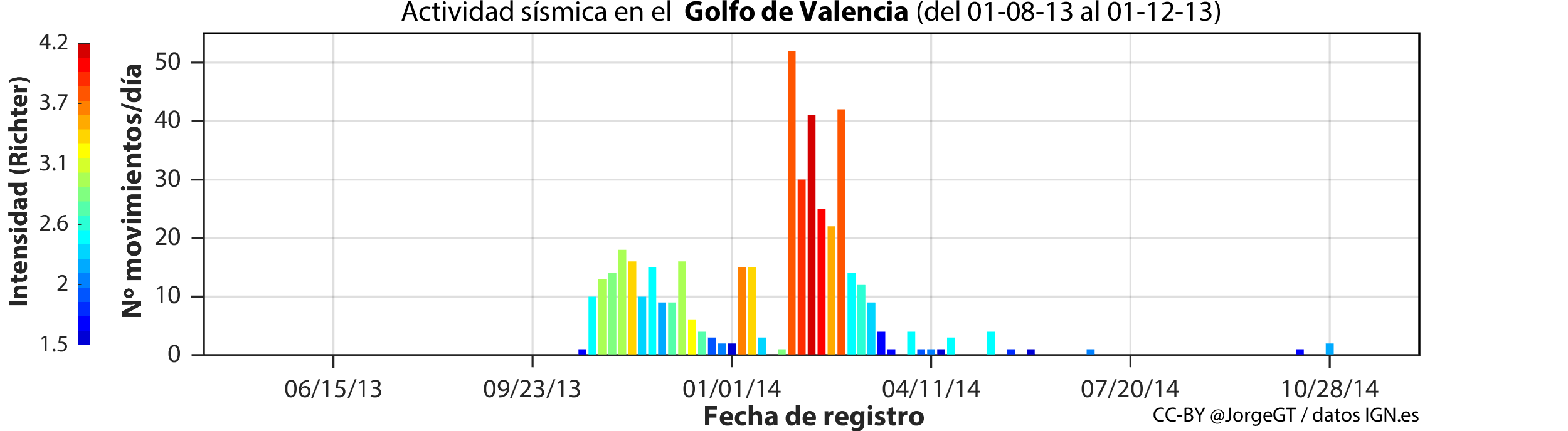 ¿Quién dijo que no se podían hacer gráficos bonitos en MATLAB? Aquí un pequeño ejemplo leyendo la web del Instituto Geográfico Nacional y graficando los eventos sísmicos que rodearon la apertura del almacén de gas Castor en el Golfo de Valencia.