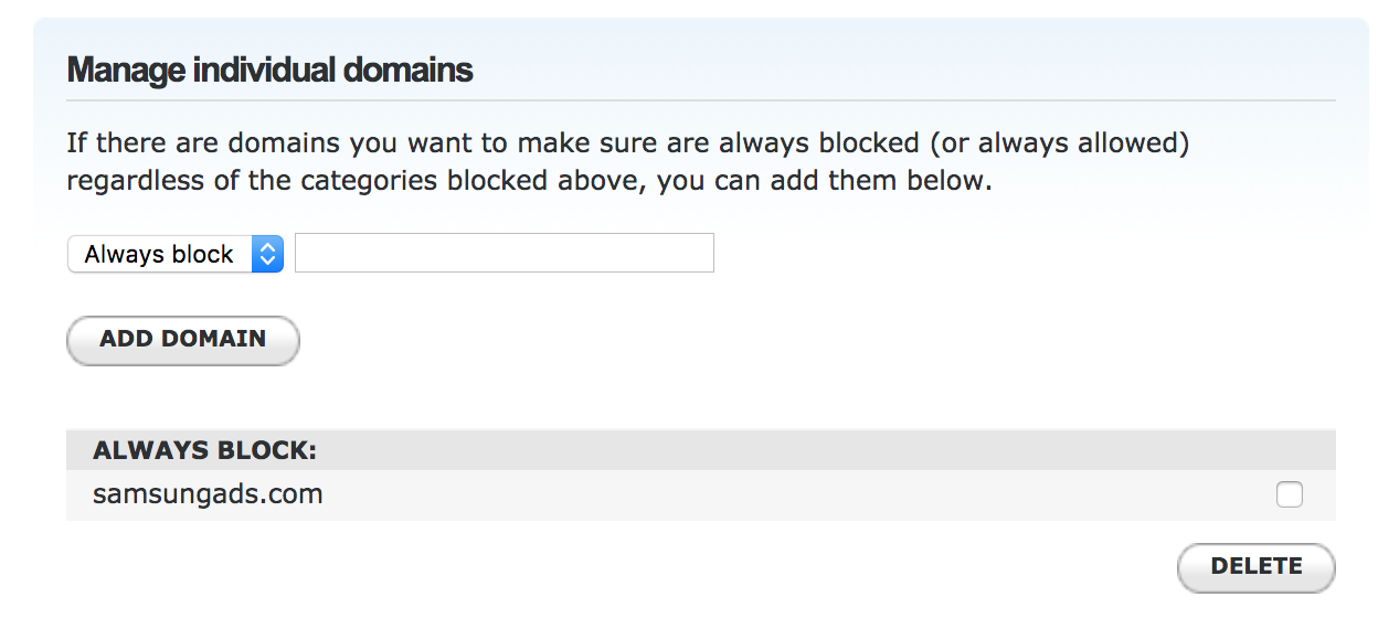 Once you've signed up and are logged into OpenDNS, head to your network's settings and find the 'Web Content Filtering' section. Here is the list of domains that I have identified, we're going to add them one-by-one to the block list, detailed under Manage Individual Domains. This list contains everything Samsung-related, but at the very minimum block samsungads.com.