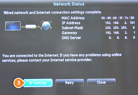 In the settings section, hit 'Network Status', your TV should check some things for a couple of seconds before showing you a screen that looks something like this: