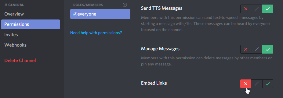 เข้าไปที่ Edit channel > Prmissions > Embed Links > กดปิด