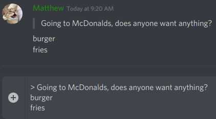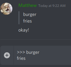 Discord สนับสนุน บล็อคโค๊ดด้วยเช่นกัน โดยใช้ backticks( ` ) หน้า-หลังข้อความ เพื่อเน้นข้อความ ทำให้พื้นข้อความเป็นสีดำ