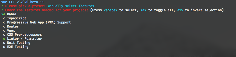 $ vue create <app_name> # Puis on l'utilise comme ceciPour Vue, le CLI en version 3 nous permet de configurer notre projet via une liste d'options.