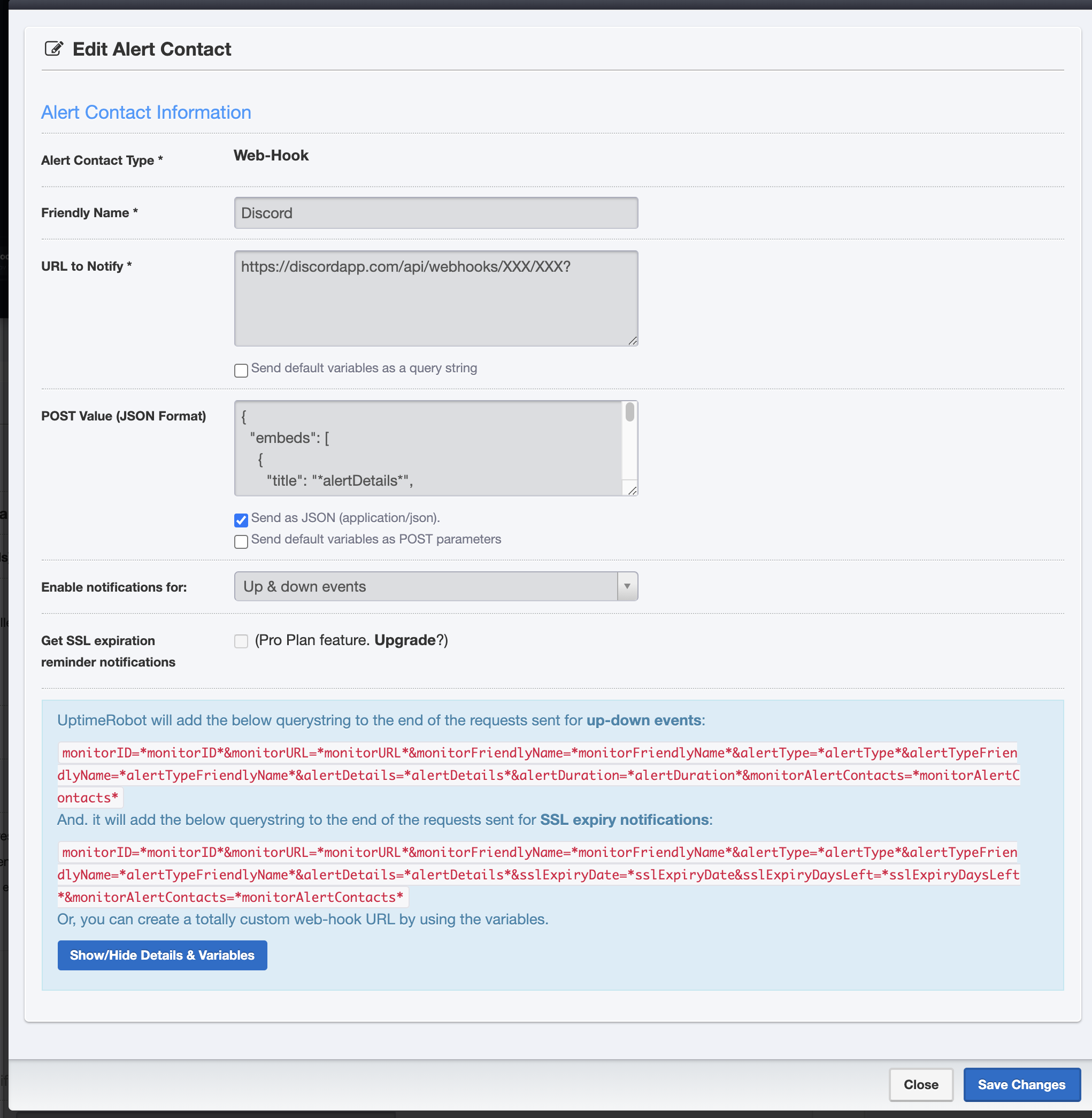 Add a Webhook in UptimeRobot and set the configuration as I have in the gist above. I was hoping it'd be straight forward. :(