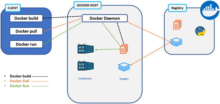 Docker uses a client–server architecture. The Docker client consists of Docker build, Docker pull, and Docker run. The client approaches the Docker daemon that further helps in building, running, and distributing Docker containers. Docker client and Docker daemon can be operated on the same system; otherwise, we can connect the Docker client to the remote Docker daemon. Both communicate with each other using the REST API, over UNIX sockets or a network.