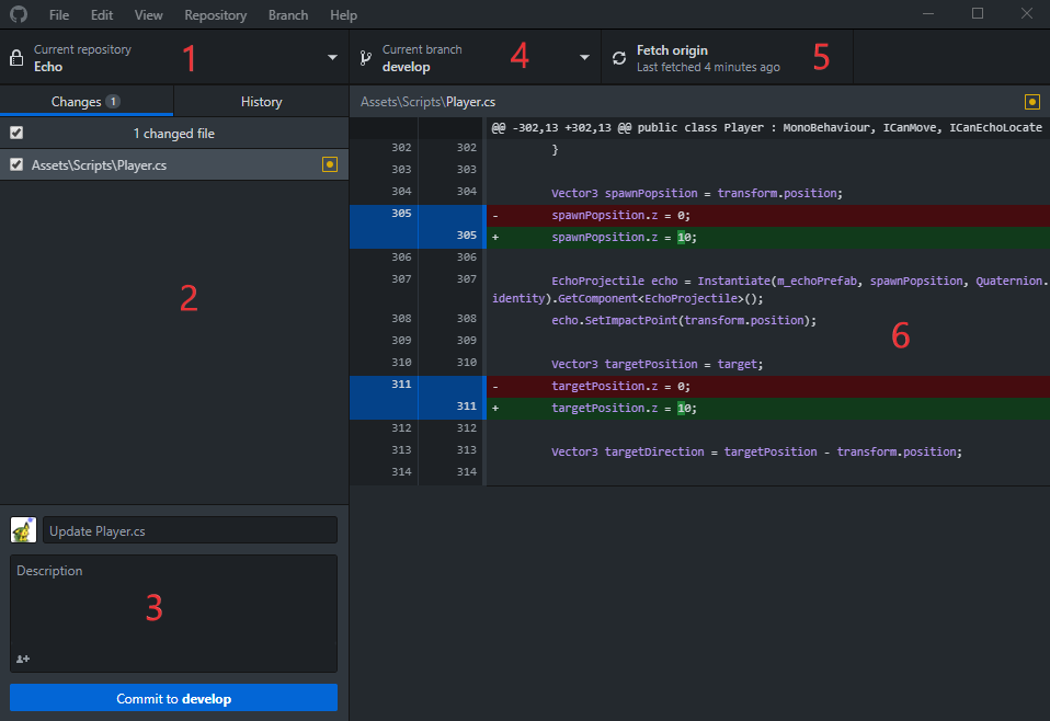 - La deuxième case sert à la description du commit. (Ex : "Change z position of spawned projectile").