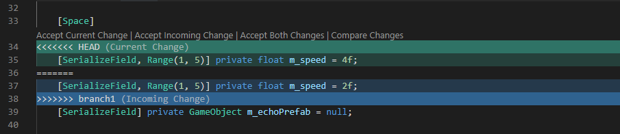 Sur l'exemple ci-dessus, les modifications ne sont pas importante. On a juste changé la vitesse du joueur. Si vous savez quelle version vous souhaitez garder, il vous suffit de cliquer sur Accept Current Change ou Accept Incoming Change (au dessus de la ligne verte) pour garder respectivement vos modifications, ou les changements sur de l'autre personne qui a travaillée sur le fichier, et supprimer l'autre version.