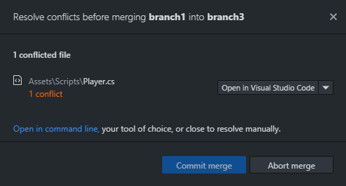 Si un conflit sauvage apparaît, à défaut de le capturer avec un pokéball, GitHub Desktop vous proposera de l'ouvrir dans Visual Studio Code (si ce dernier est installé sur votre machine) afin de le résoudre.