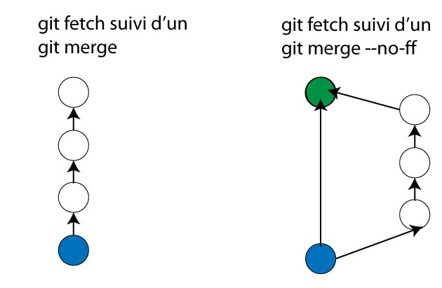 - git merge -> fusionne les changements récupérés avec votre travail local. Vous pouvez utiliser l'option --no-ff pour créer un commit de merge ce qui est potentiellement plus propre et facilite le revert de tous vos changements sur la branche si une erreur s'est glissée dans vos commits.