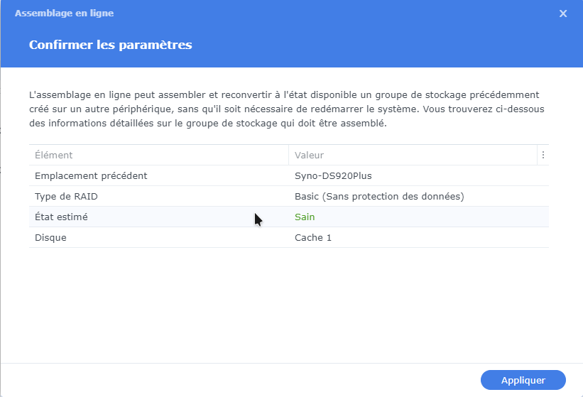 Pour la création d'un disque en Basic, il faut créer une unique partition en RAID1 afin que DSM la reconnaisse. (C'est ce que fait DSM quand il crée un volume basic.)