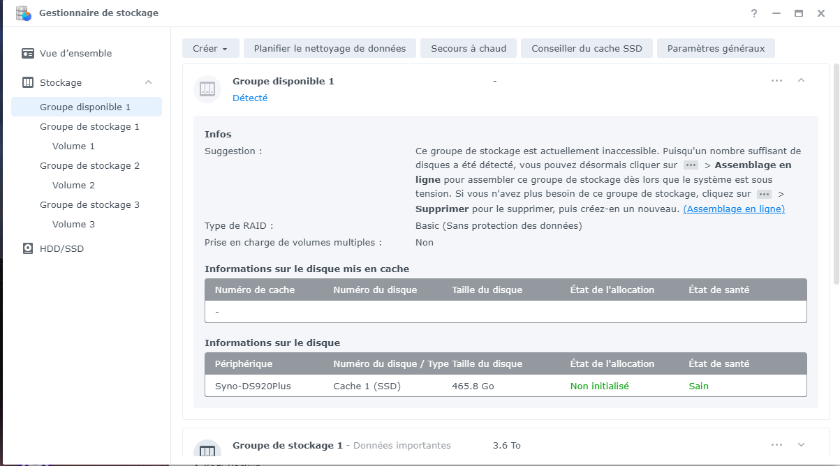 Dans mon cas, j'ai donc les deux partitions de DSM (système et swap), plus trois volumes en raid, ce qui correspond (à peu près pour le raid) à ce que j'ai :