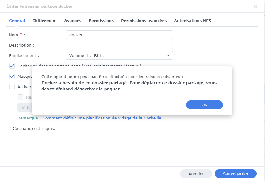 Ce dossier ne peut pas être déplacer dans le /volume4 fraichement créé car Docker est en cours d'exécution et est installé. Même Docker stoppé, ce n'est pas possible :