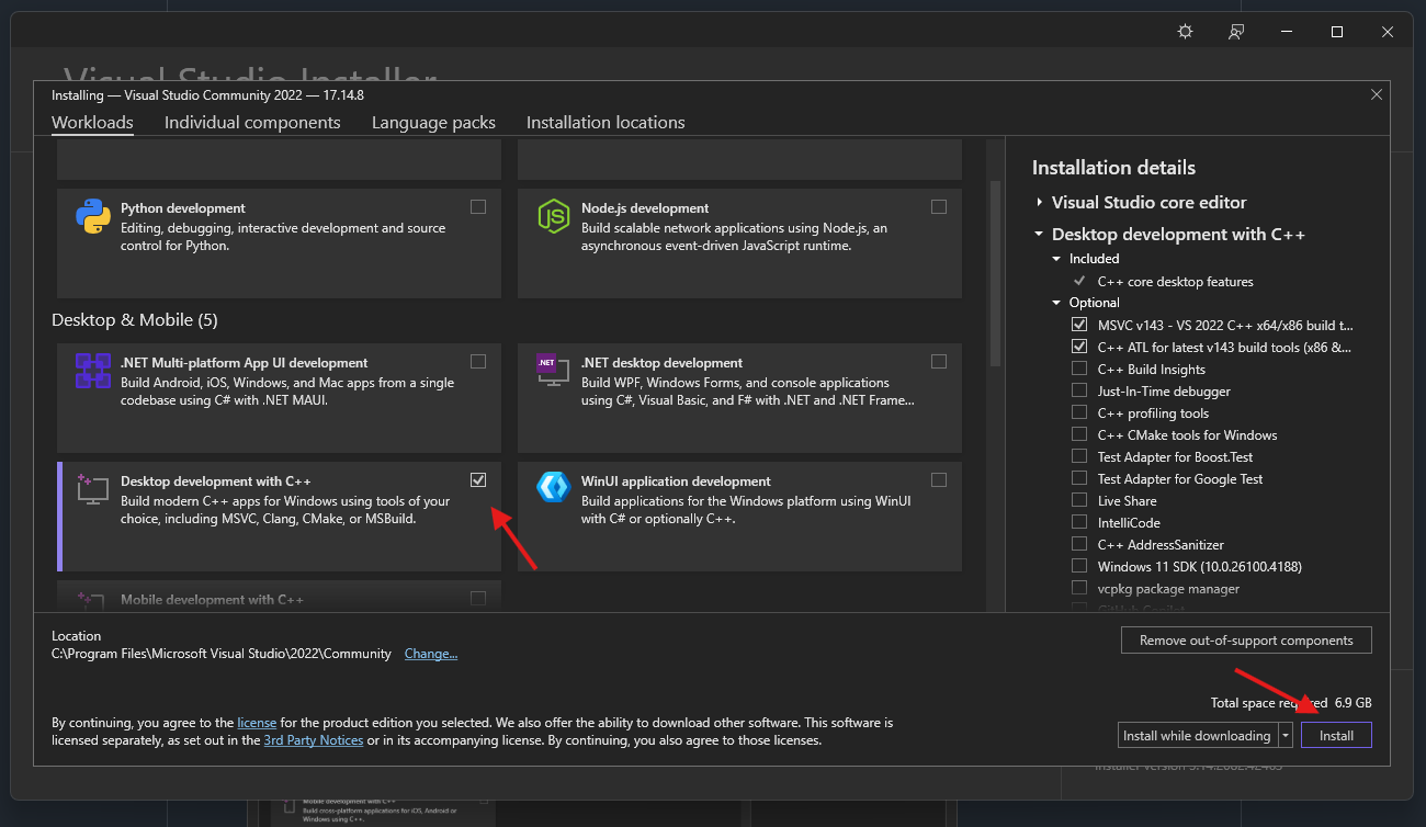 Click the "Install while downloading" button to begin installing Visual Studio 2022.